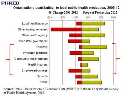 On a related note, earlier this year we completed some preliminary analyses that examine the extent to which private-sector organizations complement vs. substitute for the work of governmental public health agencies when they contribute to public health activities. The early results suggest a mixed bag, with hospital contributions being primarily complementary while the contributions of physician practices and employers function as substitutes.