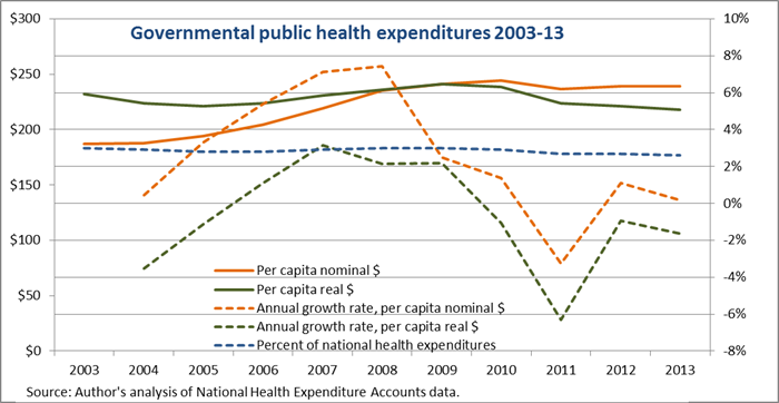 Among the many joys of a new year are the refreshed and updated full-year estimates of national health spending from the federal government’s National Health Expenditure Accounts (NHEA). We now have the federal government’s official estimates of spending from calendar 2013, including the estimates of governmental public health spending that are of particular interest for readers of this blog. Unfortunately these data show a public health sector that has yet to recover from the recessionary contractions and austerity-minded fiscal responses of recent years (see figure).