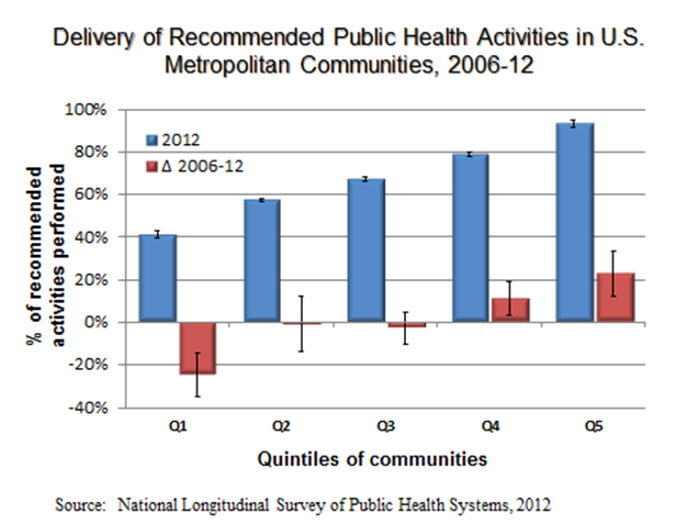 We reported previously that between 2006 and 2012, the average U.S. community experienced a 5% reduction in the proportion of recommended public health activities that were actually implemented in the community. However, this average decrement in public health protections masks considerable heterogeneity across the U.S. The bottom 20% of communities experienced a whopping 25% reduction in the delivery of core public health activities over this timeframe, while the top 20% of communities gained additional activities despite the economic contraction (see figure). The net result was a widening of the gap between the “haves” and the “have nots” in terms of community-wide public health protections.