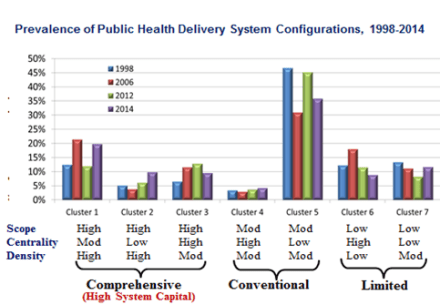 For the second year in a row we organized a methods workshop on social network analysis in health services research, which featured some innovative research on physician networks using claims data by Harvard’s Bruce Landon, along with studies of interdisciplinary care teams by the University of Minnesota’s Doug Wholey, and our own work using network analysis to evaluate multi-sectoral public health delivery systems (see figures). We also joined colleagues at RWJF in presenting a session on the three new research programs being implemented as part of RWJF’s Culture of Health action framework. These sessions represent only a small fraction of the new research on public health services and systems presented at the ARM, including an entire adjunct Interest Group Meeting on public health systems research.