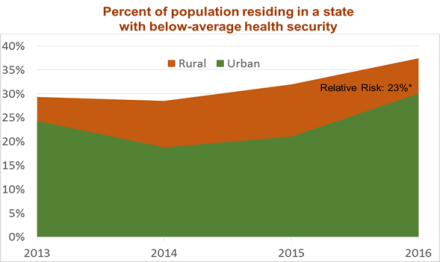 The National Health Security Preparedness Index uses big data and analytics to summarize the strength of health security protections across the U.S. and to track changes over time. The latest results show trends for the period 2013 through 2016 for every U.S. state and the nation as a whole. The comforting news is that health security has trended upward steadily for the nation as a whole. The troubling news is that some people enjoy much stronger protections than others based solely on where they live. For example, the Index shows that residents of the Deep South experience health security levels that fall significantly below the national average, despite their history of exposure to hurricanes and other damaging storms. Across the U.S., states with higher poverty levels, larger rural populations, and lower rates of health insurance coverage tend to fall below the national average on measures of health security.
