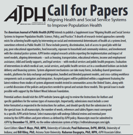 To synthesize and spread the emerging evidence from this growing area of research, we are collaborating with the American Journal of Public Health to produce a special supplement issue on health and social system alignment. This issue will feature the latest findings from studies of system alignment models tested in communities across the U.S.–including a careful examination of both successes and failures—along with discussions of the policies and practices needed to spread and sustain promising models. This issue will prioritize empirical research articles that offer evidence about the implementation and impact of system alignment strategies, but we will also consider other types of AJPH manuscripts such as analytic essays, and field reports on innovations in practice. This issue will appear in print and online in summer 2020.